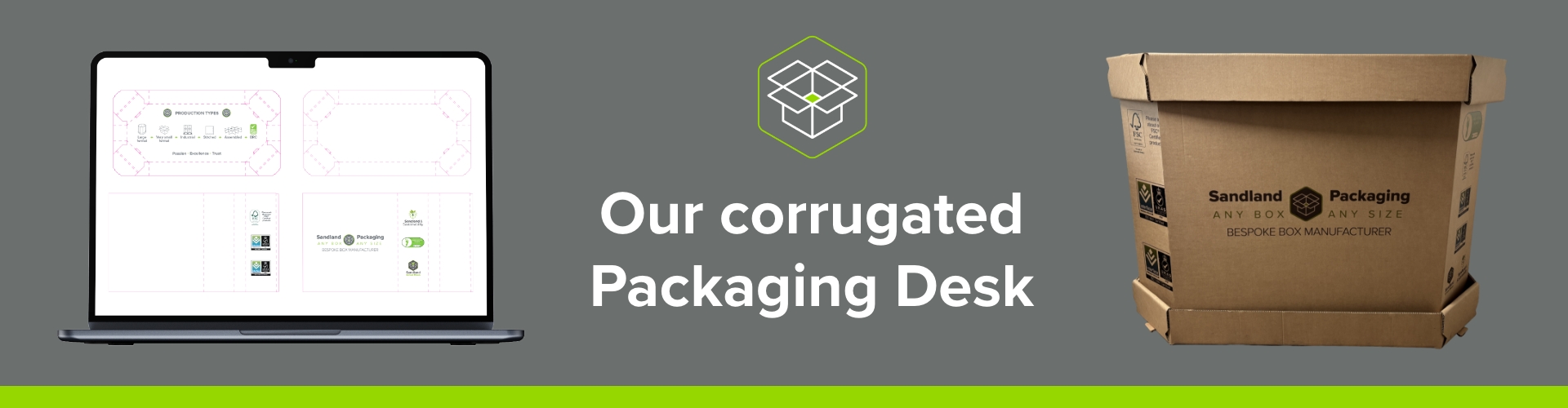 Sustainability is a central pillar at Sandland Packaging and we needed to be able to communicate that quickly and efficiently. To do this we ensured our Carbon Neutral, FSC and ISOs logos were printed clearly on to the Trade Show Desk. This also helped let everyone know that they can print their boxes in two colours flexo with Sandland Packaging.